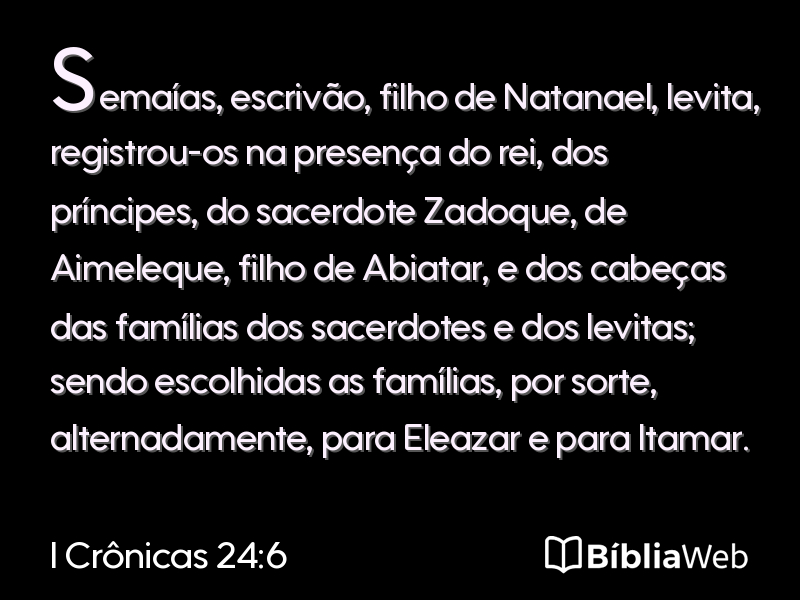 6Semaías, escrivão, filho de Natanael, levita, registrou-os na presença do rei, dos príncipes, do sacerdote Zadoque, de Aimeleque, filho de Abiatar, e dos cabeças das famílias dos sacerdotes e dos levitas; sendo escolhidas as famílias, por sorte, alternadamente, para Eleazar e para Itamar.