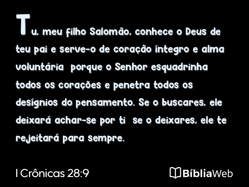 9Tu, meu filho Salomão, conhece o Deus de teu pai e serve-o de coração íntegro e alma voluntária; porque o Senhor esquadrinha todos os corações e penetra todos os desígnios do pensamento. Se o buscares, ele deixará achar-se por ti; se o deixares, ele te rejeitará para sempre.