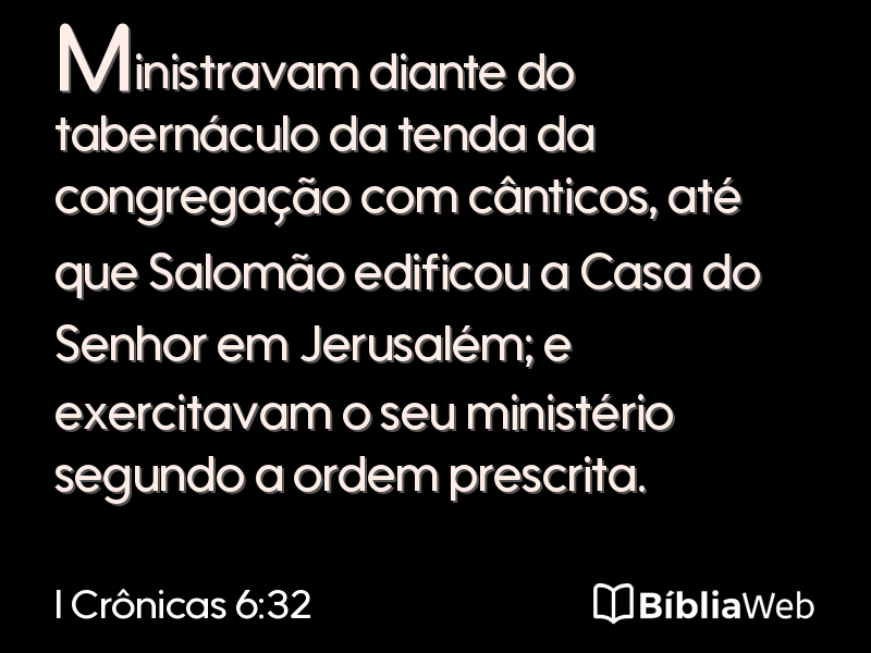 32Ministravam diante do tabernáculo da tenda da congregação com cânticos, até que Salomão edificou a Casa do Senhor em Jerusalém; e exercitavam o seu ministério segundo a ordem prescrita.