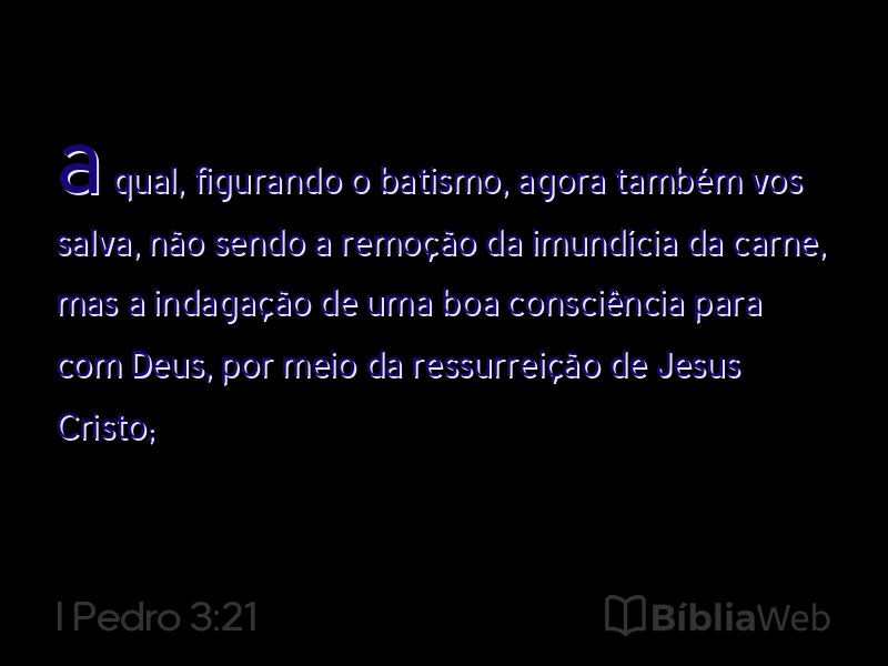 21a qual, figurando o batismo, agora também vos salva, não sendo a remoção da imundícia da carne, mas a indagação de uma boa consciência para com Deus, por meio da ressurreição de Jesus Cristo;