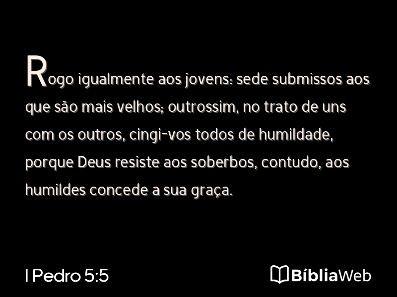 5Rogo igualmente aos jovens: sede submissos aos que são mais velhos; outrossim, no trato de uns com os outros, cingi-vos todos de humildade, porque Deus resiste aos soberbos, contudo, aos humildes concede a sua graça.