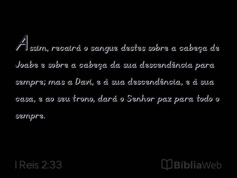33Assim, recairá o sangue destes sobre a cabeça de Joabe e sobre a cabeça da sua descendência para sempre; mas a Davi, e à sua descendência, e à sua casa, e ao seu trono, dará o Senhor paz para todo o sempre.