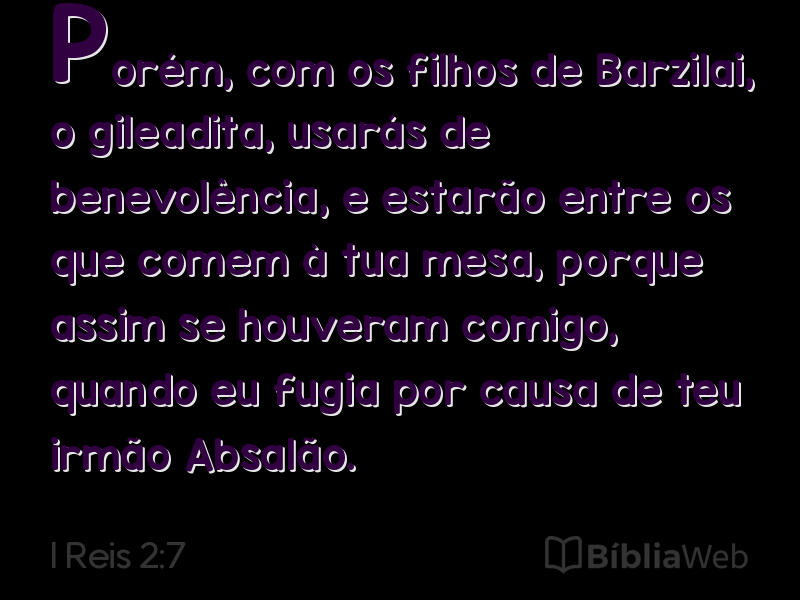 7Porém, com os filhos de Barzilai, o gileadita, usarás de benevolência, e estarão entre os que comem à tua mesa, porque assim se houveram comigo, quando eu fugia por causa de teu irmão Absalão.
