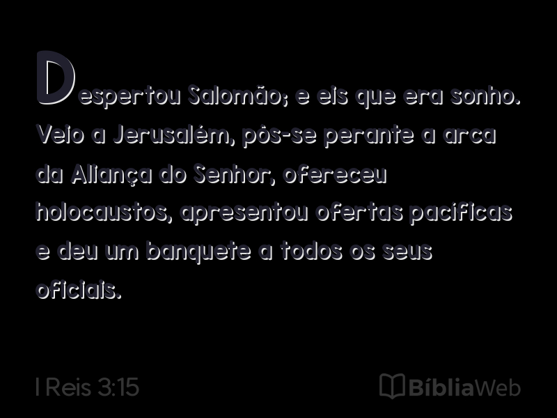 15Despertou Salomão; e eis que era sonho. Veio a Jerusalém, pôs-se perante a arca da Aliança do Senhor, ofereceu holocaustos, apresentou ofertas pacíficas e deu um banquete a todos os seus oficiais.