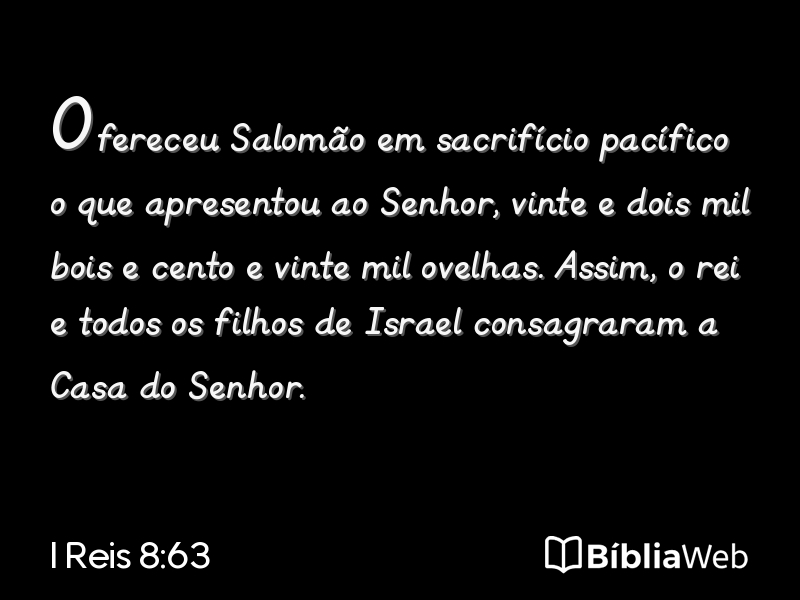 63Ofereceu Salomão em sacrifício pacífico o que apresentou ao Senhor, vinte e dois mil bois e cento e vinte mil ovelhas. Assim, o rei e todos os filhos de Israel consagraram a Casa do Senhor.