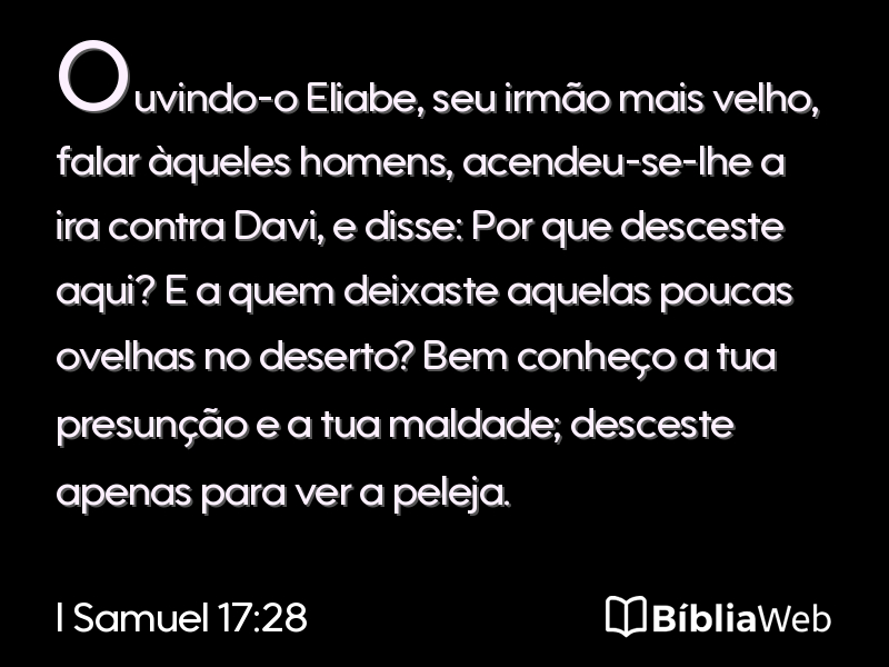28Ouvindo-o Eliabe, seu irmão mais velho, falar àqueles homens, acendeu-se-lhe a ira contra Davi, e disse: Por que desceste aqui? E a quem deixaste aquelas poucas ovelhas no deserto? Bem conheço a tua presunção e a tua maldade; desceste apenas para ver a peleja.