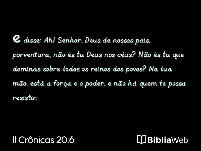 6e disse: Ah! Senhor, Deus de nossos pais, porventura, não és tu Deus nos céus? Não és tu que dominas sobre todos os reinos dos povos? Na tua mão, está a força e o poder, e não há quem te possa resistir.