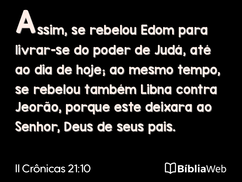 10Assim, se rebelou Edom para livrar-se do poder de Judá, até ao dia de hoje; ao mesmo tempo, se rebelou também Libna contra Jeorão, porque este deixara ao Senhor, Deus de seus pais.