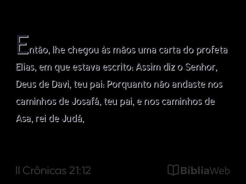 12Então, lhe chegou às mãos uma carta do profeta Elias, em que estava escrito: Assim diz o Senhor, Deus de Davi, teu pai: Porquanto não andaste nos caminhos de Josafá, teu pai, e nos caminhos de Asa, rei de Judá,