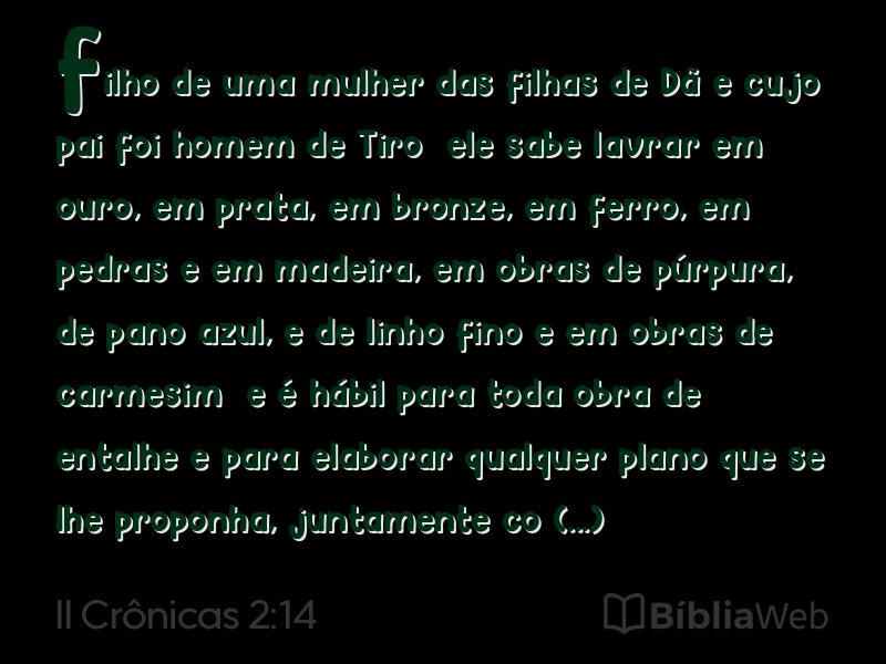 14filho de uma mulher das filhas de Dã e cujo pai foi homem de Tiro; ele sabe lavrar em ouro, em prata, em bronze, em ferro, em pedras e em madeira, em obras de púrpura, de pano azul, e de linho fino e em obras de carmesim; e é hábil para toda obra de entalhe e para elaborar qualquer plano que se lhe proponha, juntamente com os teus peritos e os peritos de Davi, meu senhor, teu pai.