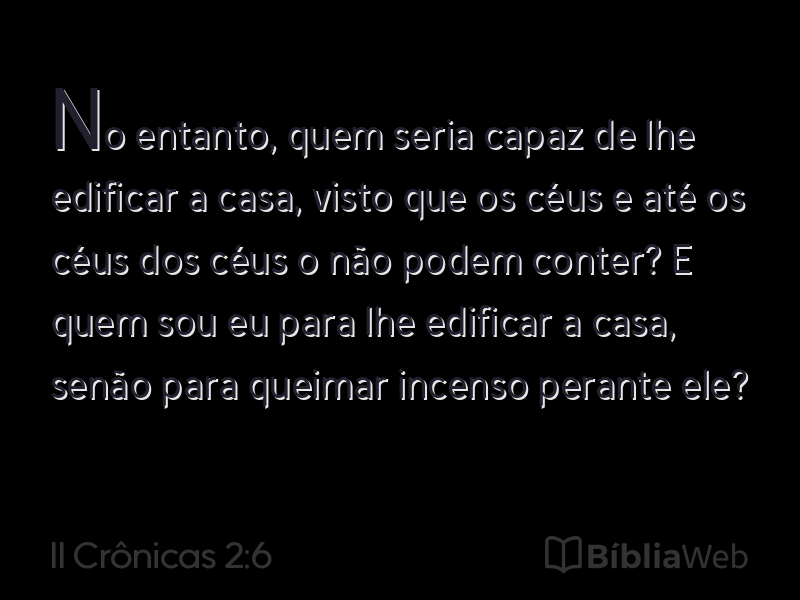6No entanto, quem seria capaz de lhe edificar a casa, visto que os céus e até os céus dos céus o não podem conter? E quem sou eu para lhe edificar a casa, senão para queimar incenso perante ele?