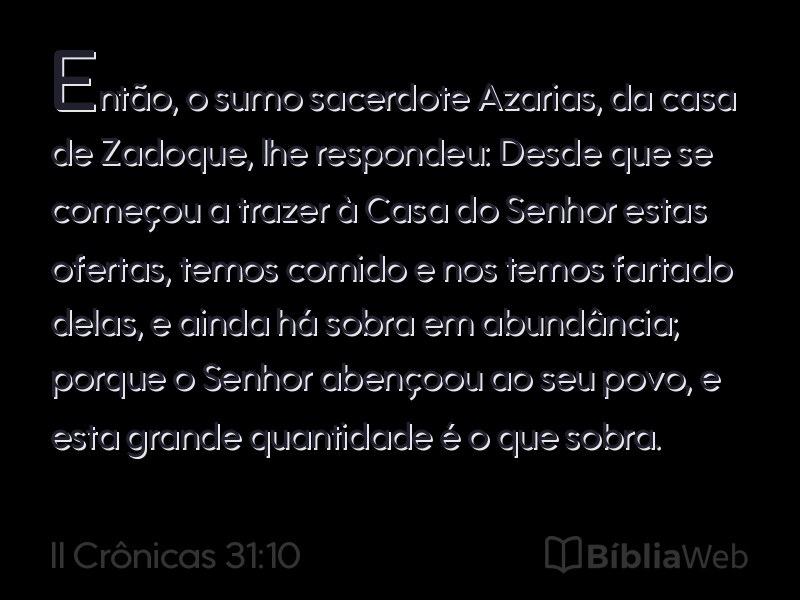 10Então, o sumo sacerdote Azarias, da casa de Zadoque, lhe respondeu: Desde que se começou a trazer à Casa do Senhor estas ofertas, temos comido e nos temos fartado delas, e ainda há sobra em abundância; porque o Senhor abençoou ao seu povo, e esta grande quantidade é o que sobra.