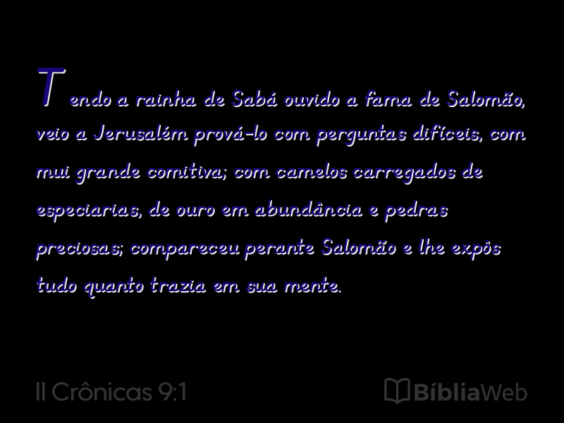 Versículo 1 de II Crônicas 9 da Bíblia. Almeida Revisada e Atualizada (1993)