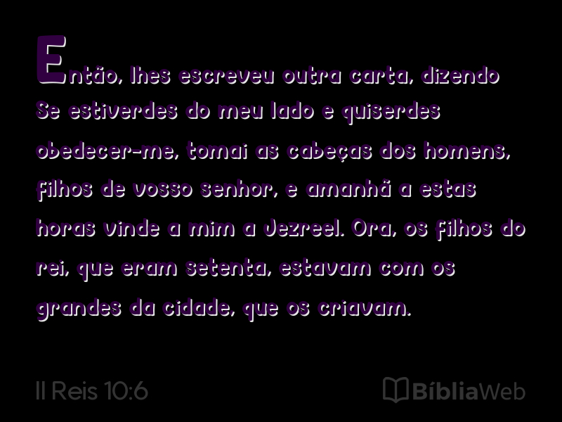 6Então, lhes escreveu outra carta, dizendo: Se estiverdes do meu lado e quiserdes obedecer-me, tomai as cabeças dos homens, filhos de vosso senhor, e amanhã a estas horas vinde a mim a Jezreel. Ora, os filhos do rei, que eram setenta, estavam com os grandes da cidade, que os criavam.