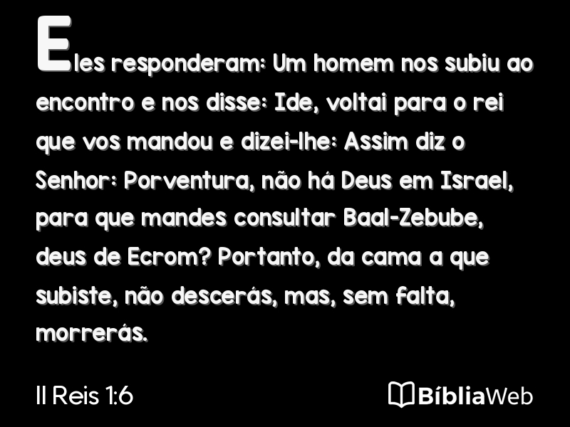 6Eles responderam: Um homem nos subiu ao encontro e nos disse: Ide, voltai para o rei que vos mandou e dizei-lhe: Assim diz o Senhor: Porventura, não há Deus em Israel, para que mandes consultar Baal-Zebube, deus de Ecrom? Portanto, da cama a que subiste, não descerás, mas, sem falta, morrerás.