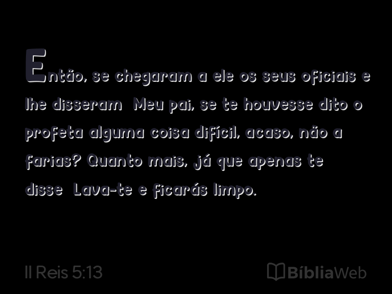 13Então, se chegaram a ele os seus oficiais e lhe disseram: Meu pai, se te houvesse dito o profeta alguma coisa difícil, acaso, não a farias? Quanto mais, já que apenas te disse: Lava-te e ficarás limpo.