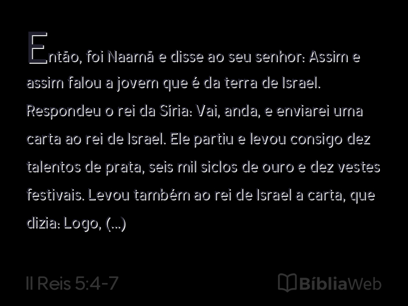 Respondeu o rei da Síria: Vai, anda, e enviarei uma carta ao rei de Israel. Ele partiu e levou consigo dez talentos de prata, seis mil siclos de ouro e dez vestes festivais.