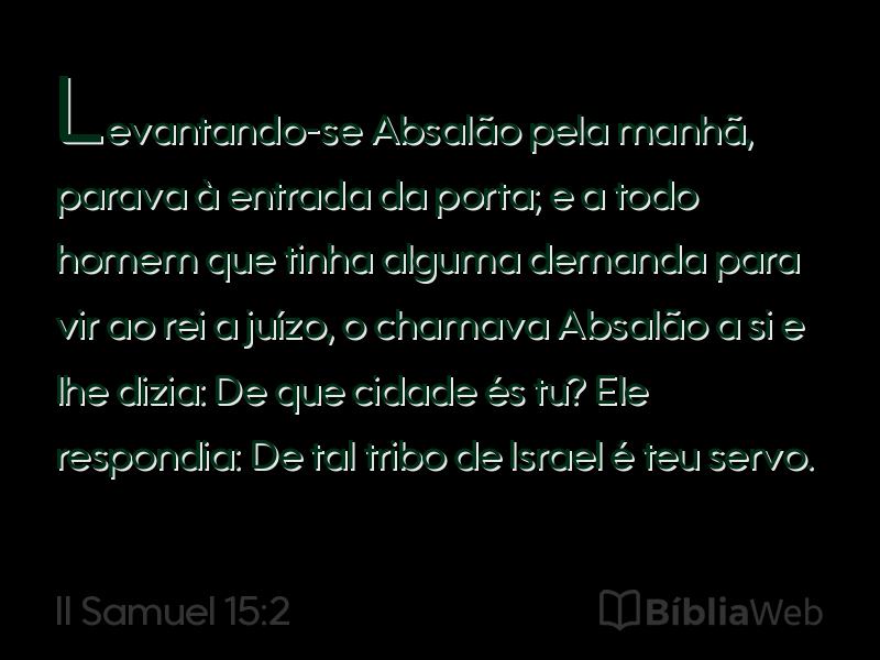 2Levantando-se Absalão pela manhã, parava à entrada da porta; e a todo homem que tinha alguma demanda para vir ao rei a juízo, o chamava Absalão a si e lhe dizia: De que cidade és tu? Ele respondia: De tal tribo de Israel é teu servo.