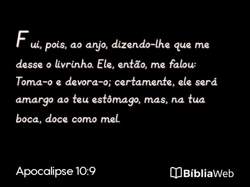 9Fui, pois, ao anjo, dizendo-lhe que me desse o livrinho. Ele, então, me falou: Toma-o e devora-o; certamente, ele será amargo ao teu estômago, mas, na tua boca, doce como mel.
