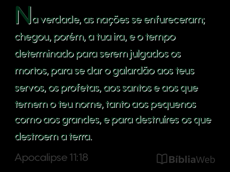 18Na verdade, as nações se enfureceram; chegou, porém, a tua ira, e o tempo determinado para serem julgados os mortos, para se dar o galardão aos teus servos, os profetas, aos santos e aos que temem o teu nome, tanto aos pequenos como aos grandes, e para destruíres os que destroem a terra.