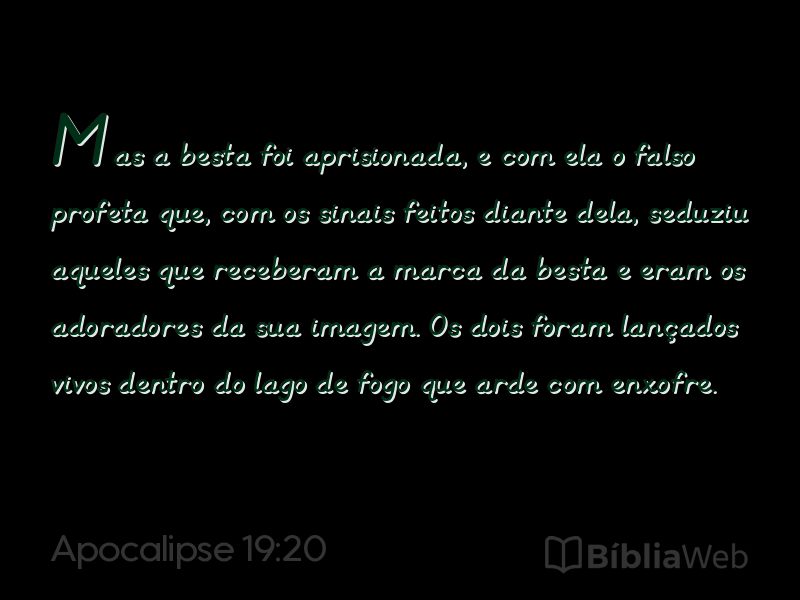 20Mas a besta foi aprisionada, e com ela o falso profeta que, com os sinais feitos diante dela, seduziu aqueles que receberam a marca da besta e eram os adoradores da sua imagem. Os dois foram lançados vivos dentro do lago de fogo que arde com enxofre.