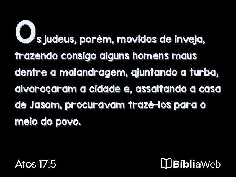5Os judeus, porém, movidos de inveja, trazendo consigo alguns homens maus dentre a malandragem, ajuntando a turba, alvoroçaram a cidade e, assaltando a casa de Jasom, procuravam trazê-los para o meio do povo.