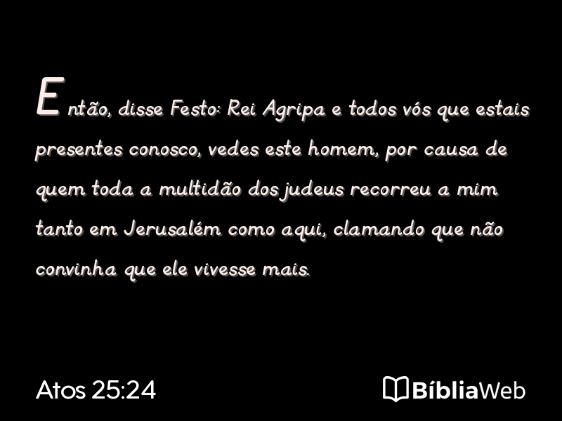 24Então, disse Festo: Rei Agripa e todos vós que estais presentes conosco, vedes este homem, por causa de quem toda a multidão dos judeus recorreu a mim tanto em Jerusalém como aqui, clamando que não convinha que ele vivesse mais.