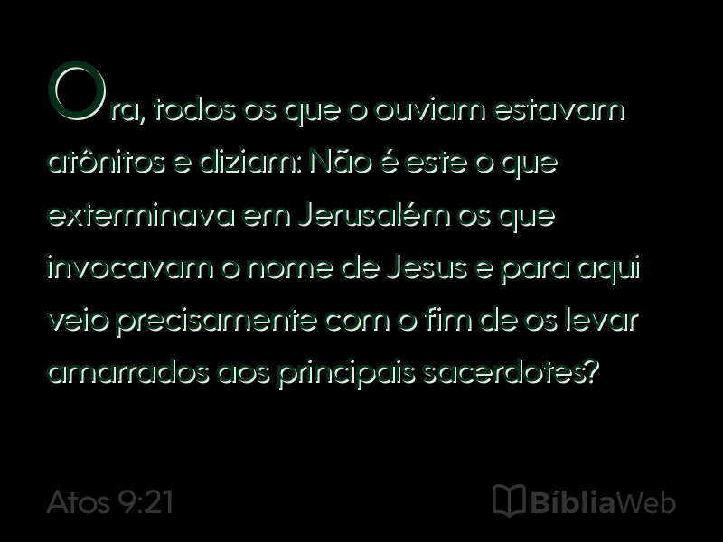 21Ora, todos os que o ouviam estavam atônitos e diziam: Não é este o que exterminava em Jerusalém os que invocavam o nome de Jesus e para aqui veio precisamente com o fim de os levar amarrados aos principais sacerdotes?