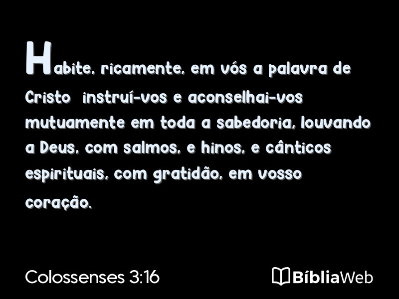 16Habite, ricamente, em vós a palavra de Cristo; instruí-vos e aconselhai-vos mutuamente em toda a sabedoria, louvando a Deus, com salmos, e hinos, e cânticos espirituais, com gratidão, em vosso coração.