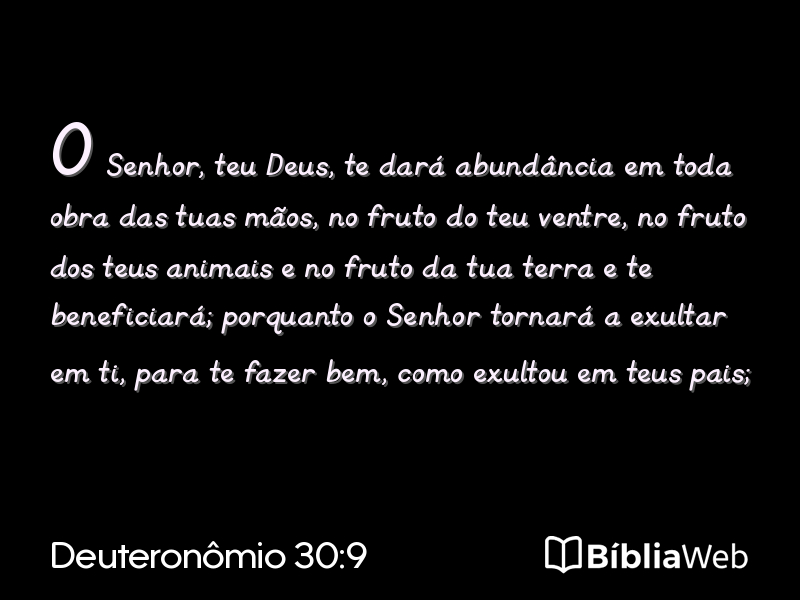 9O Senhor, teu Deus, te dará abundância em toda obra das tuas mãos, no fruto do teu ventre, no fruto dos teus animais e no fruto da tua terra e te beneficiará; porquanto o Senhor tornará a exultar em ti, para te fazer bem, como exultou em teus pais;