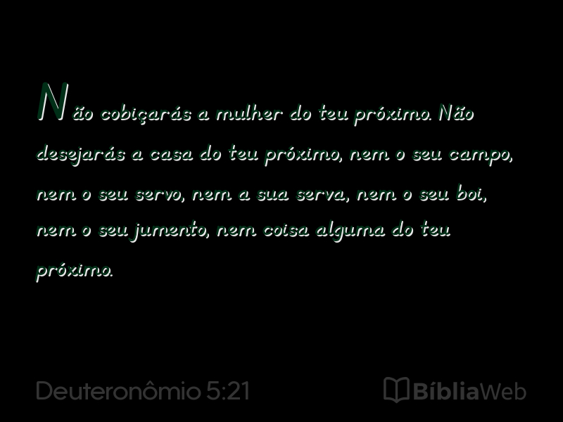 21Não cobiçarás a mulher do teu próximo. Não desejarás a casa do teu próximo, nem o seu campo, nem o seu servo, nem a sua serva, nem o seu boi, nem o seu jumento, nem coisa alguma do teu próximo.