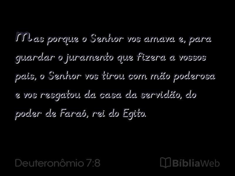 8mas porque o Senhor vos amava e, para guardar o juramento que fizera a vossos pais, o Senhor vos tirou com mão poderosa e vos resgatou da casa da servidão, do poder de Faraó, rei do Egito.
