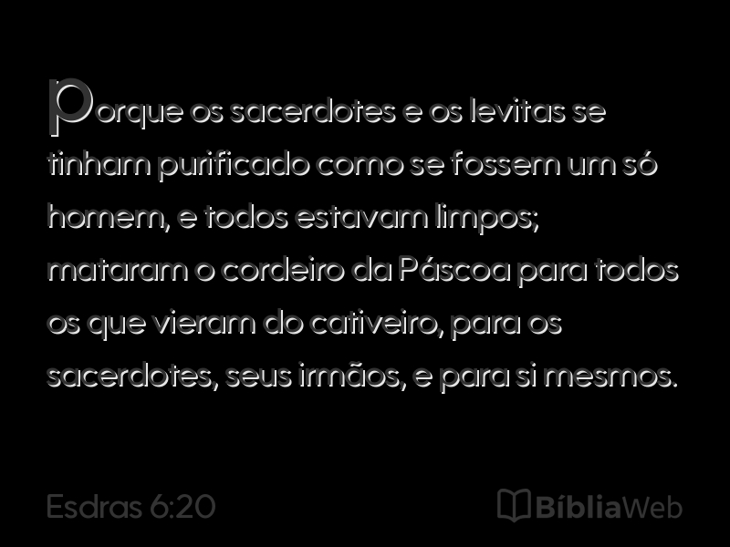 20porque os sacerdotes e os levitas se tinham purificado como se fossem um só homem, e todos estavam limpos; mataram o cordeiro da Páscoa para todos os que vieram do cativeiro, para os sacerdotes, seus irmãos, e para si mesmos.
