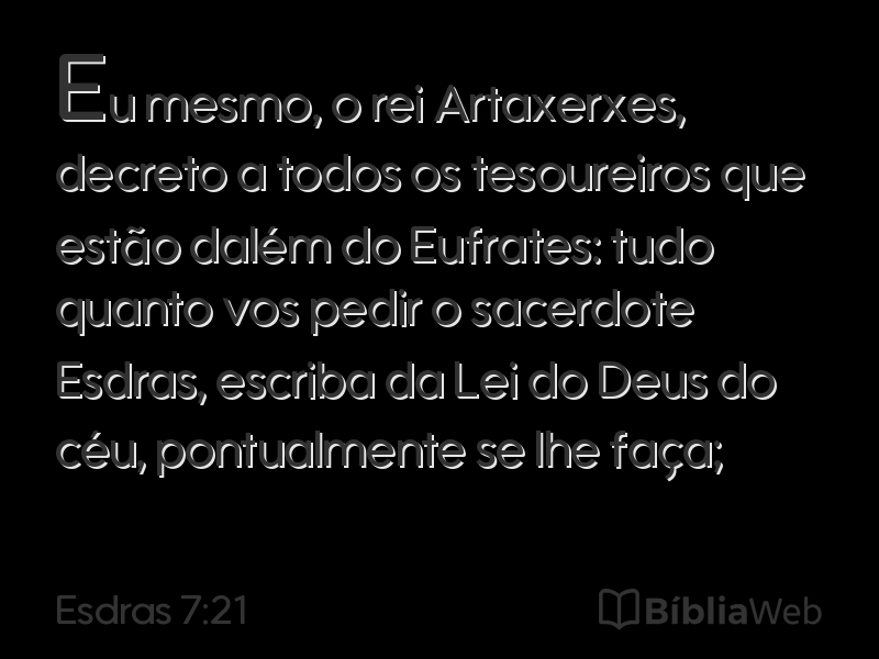 21Eu mesmo, o rei Artaxerxes, decreto a todos os tesoureiros que estão dalém do Eufrates: tudo quanto vos pedir o sacerdote Esdras, escriba da Lei do Deus do céu, pontualmente se lhe faça;