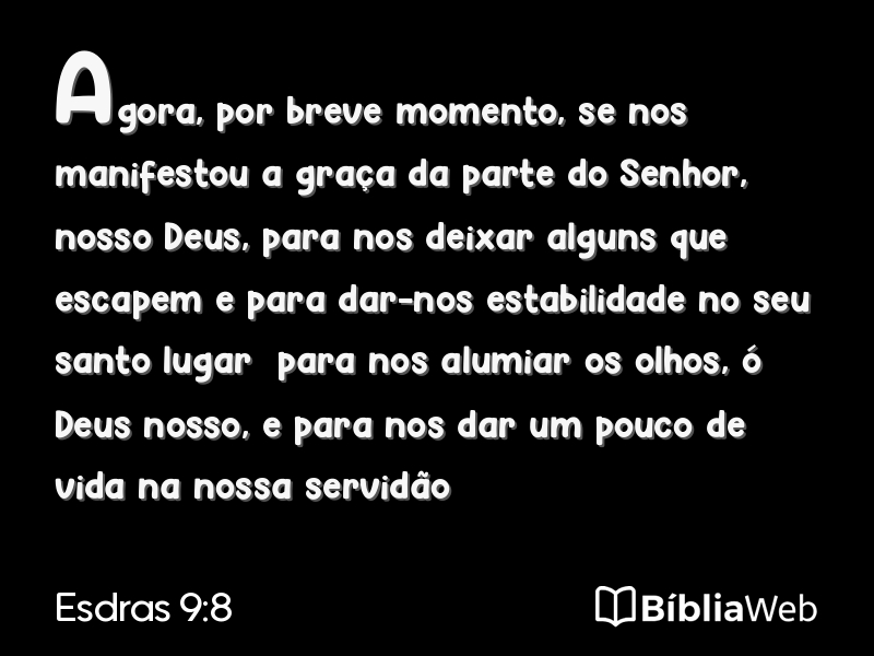 8Agora, por breve momento, se nos manifestou a graça da parte do Senhor, nosso Deus, para nos deixar alguns que escapem e para dar-nos estabilidade no seu santo lugar; para nos alumiar os olhos, ó Deus nosso, e para nos dar um pouco de vida na nossa servidão;