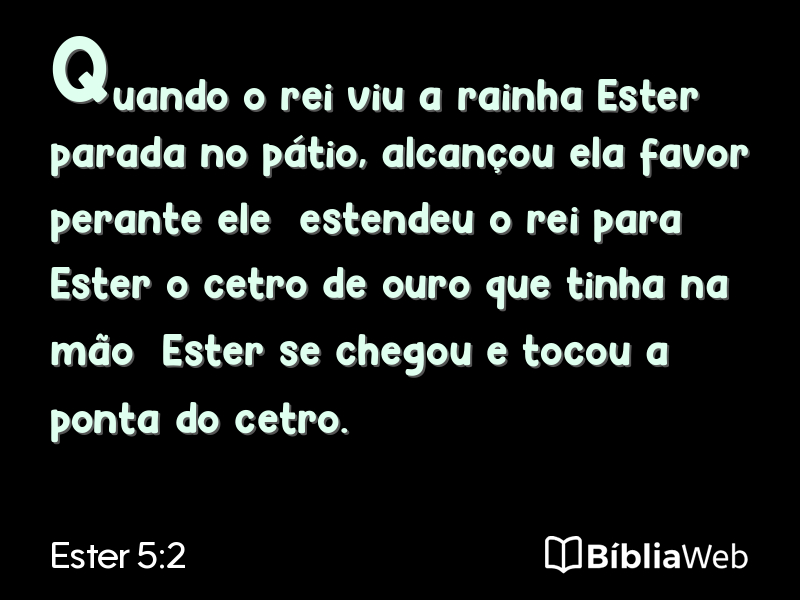 2Quando o rei viu a rainha Ester parada no pátio, alcançou ela favor perante ele; estendeu o rei para Ester o cetro de ouro que tinha na mão; Ester se chegou e tocou a ponta do cetro.