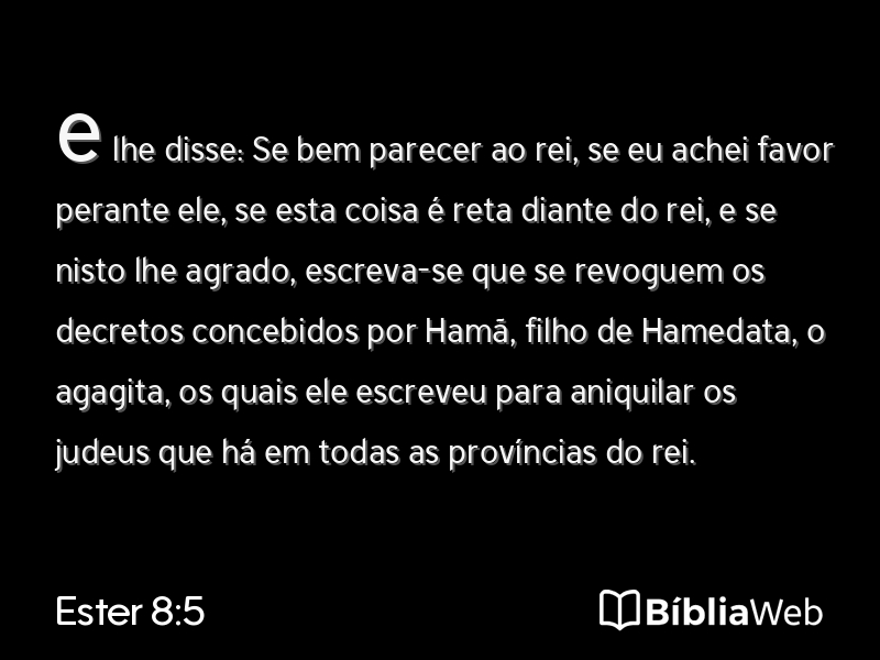 5e lhe disse: Se bem parecer ao rei, se eu achei favor perante ele, se esta coisa é reta diante do rei, e se nisto lhe agrado, escreva-se que se revoguem os decretos concebidos por Hamã, filho de Hamedata, o agagita, os quais ele escreveu para aniquilar os judeus que há em todas as províncias do rei.