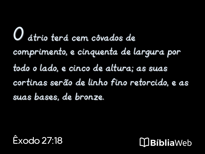18O átrio terá cem côvados de comprimento, e cinquenta de largura por todo o lado, e cinco de altura; as suas cortinas serão de linho fino retorcido, e as suas bases, de bronze.
