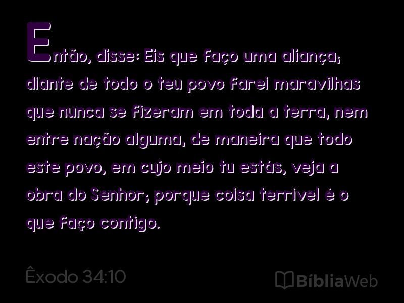 10Então, disse: Eis que faço uma aliança; diante de todo o teu povo farei maravilhas que nunca se fizeram em toda a terra, nem entre nação alguma, de maneira que todo este povo, em cujo meio tu estás, veja a obra do Senhor; porque coisa terrível é o que faço contigo.