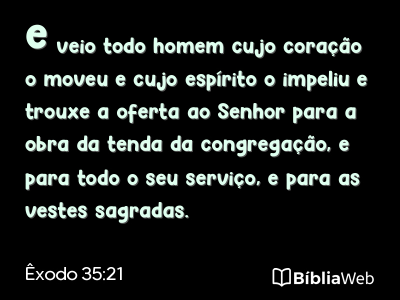21e veio todo homem cujo coração o moveu e cujo espírito o impeliu e trouxe a oferta ao Senhor para a obra da tenda da congregação, e para todo o seu serviço, e para as vestes sagradas.