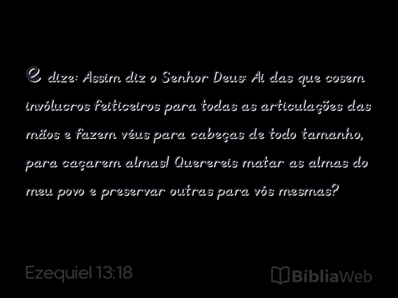 18e dize: Assim diz o Senhor Deus: Ai das que cosem invólucros feiticeiros para todas as articulações das mãos e fazem véus para cabeças de todo tamanho, para caçarem almas! Querereis matar as almas do meu povo e preservar outras para vós mesmas?