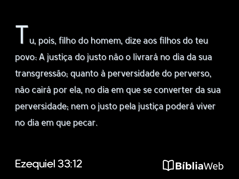12Tu, pois, filho do homem, dize aos filhos do teu povo: A justiça do justo não o livrará no dia da sua transgressão; quanto à perversidade do perverso, não cairá por ela, no dia em que se converter da sua perversidade; nem o justo pela justiça poderá viver no dia em que pecar.