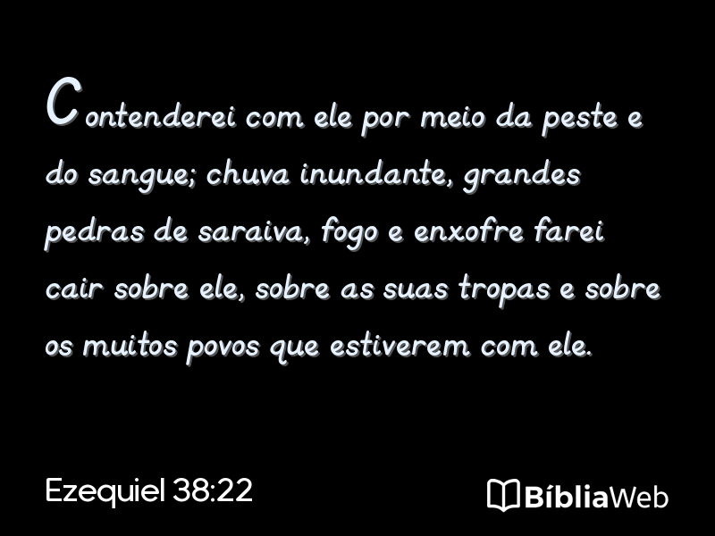 22Contenderei com ele por meio da peste e do sangue; chuva inundante, grandes pedras de saraiva, fogo e enxofre farei cair sobre ele, sobre as suas tropas e sobre os muitos povos que estiverem com ele.
