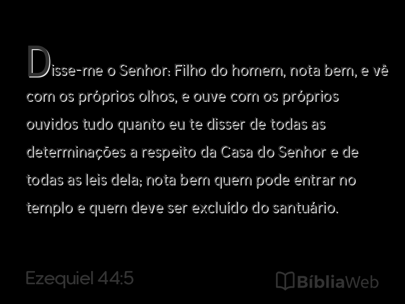 5Disse-me o Senhor: Filho do homem, nota bem, e vê com os próprios olhos, e ouve com os próprios ouvidos tudo quanto eu te disser de todas as determinações a respeito da Casa do Senhor e de todas as leis dela; nota bem quem pode entrar no templo e quem deve ser excluído do santuário.