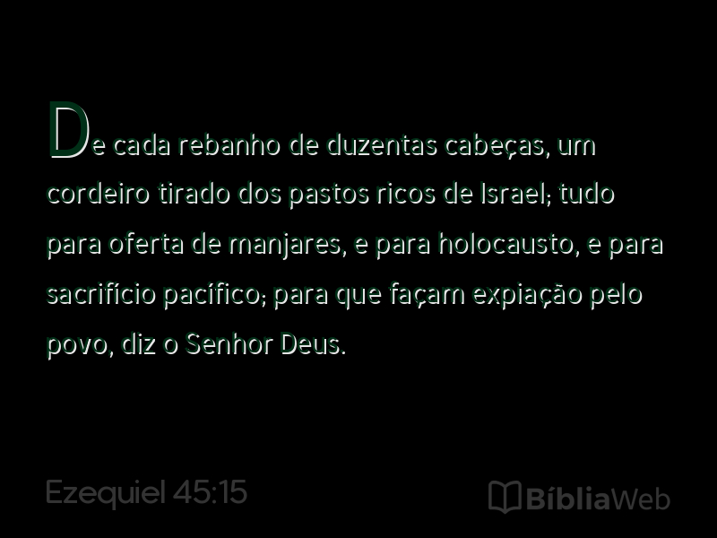 15De cada rebanho de duzentas cabeças, um cordeiro tirado dos pastos ricos de Israel; tudo para oferta de manjares, e para holocausto, e para sacrifício pacífico; para que façam expiação pelo povo, diz o Senhor Deus.