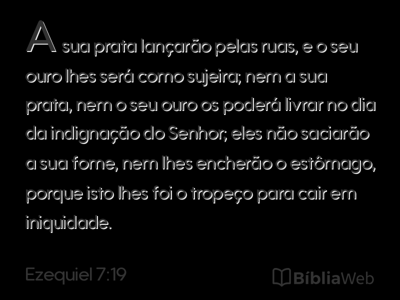 19A sua prata lançarão pelas ruas, e o seu ouro lhes será como sujeira; nem a sua prata, nem o seu ouro os poderá livrar no dia da indignação do Senhor; eles não saciarão a sua fome, nem lhes encherão o estômago, porque isto lhes foi o tropeço para cair em iniquidade.