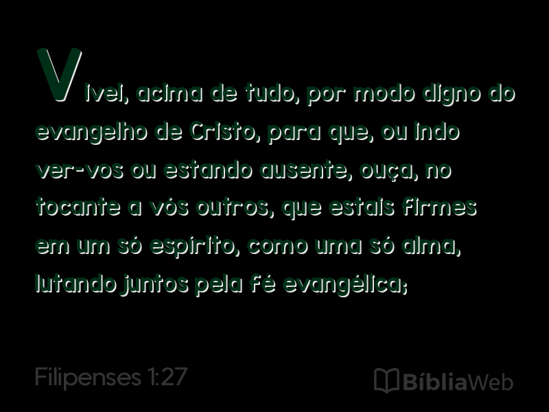 27Vivei, acima de tudo, por modo digno do evangelho de Cristo, para que, ou indo ver-vos ou estando ausente, ouça, no tocante a vós outros, que estais firmes em um só espírito, como uma só alma, lutando juntos pela fé evangélica;