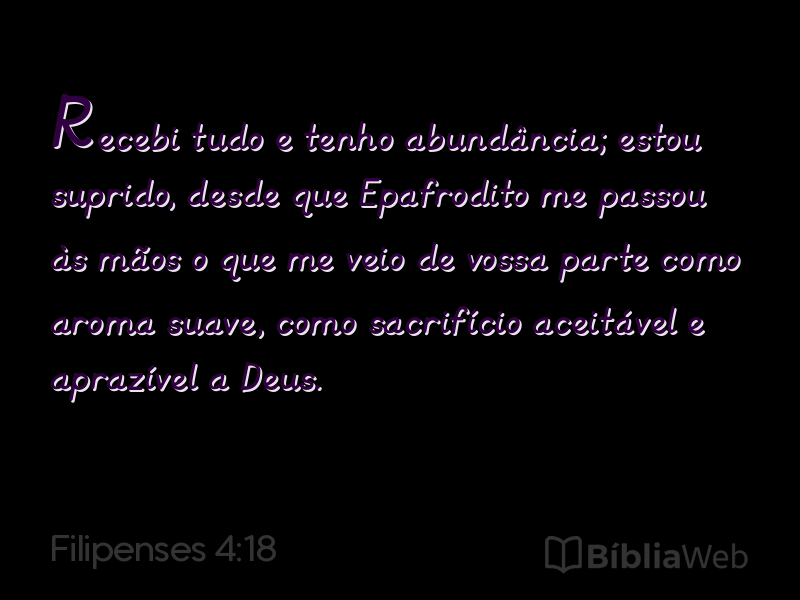 18Recebi tudo e tenho abundância; estou suprido, desde que Epafrodito me passou às mãos o que me veio de vossa parte como aroma suave, como sacrifício aceitável e aprazível a Deus.