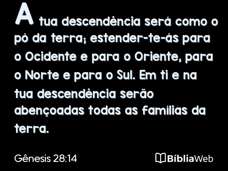 14A tua descendência será como o pó da terra; estender-te-ás para o Ocidente e para o Oriente, para o Norte e para o Sul. Em ti e na tua descendência serão abençoadas todas as famílias da terra.