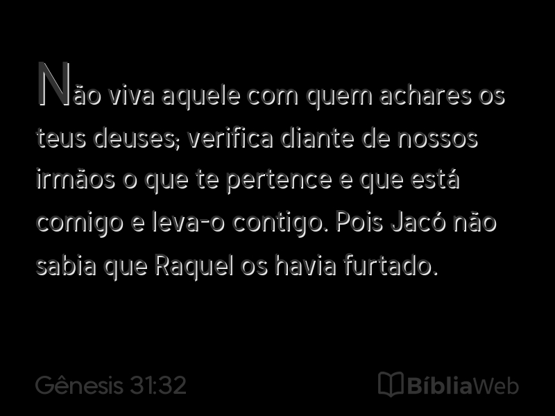 32Não viva aquele com quem achares os teus deuses; verifica diante de nossos irmãos o que te pertence e que está comigo e leva-o contigo. Pois Jacó não sabia que Raquel os havia furtado.